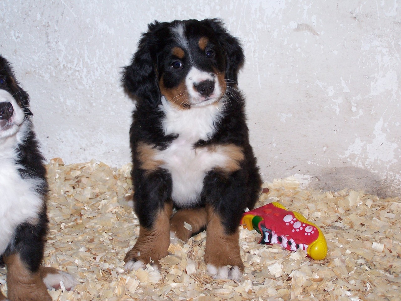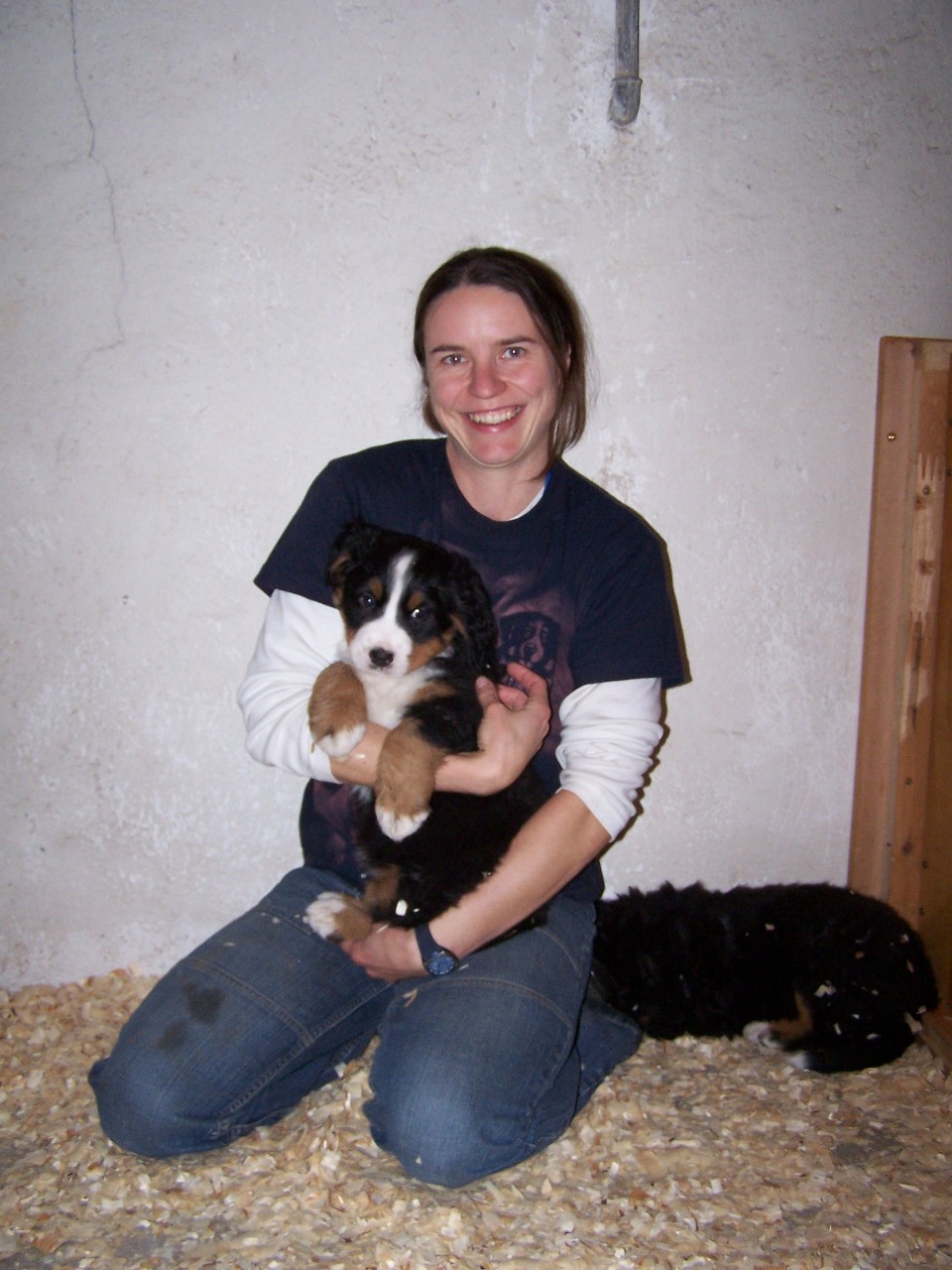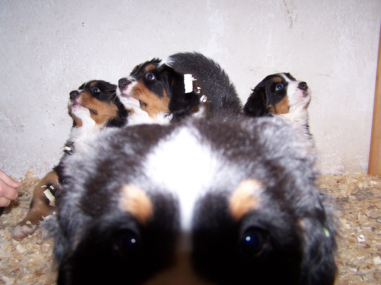 Dnes za námi přijel i tatínek našich štěňátek - fotit dohromady moc nešlo :-) Když už nejančily holčičky, tak poskakoval taťka - no uvidíme, zda se něco podařilo. Každopádně štěňátka měla z tak velkého psa (sice podobného mámě, ale přeci jen to není ono) respekt a chvíli se schovávala. Nejvíc si rozuměli s Adinou - ta si s ním nakonec chtěla i hrát. A kdoví jak by to dopadlo, kdybychom je nezavřeli...