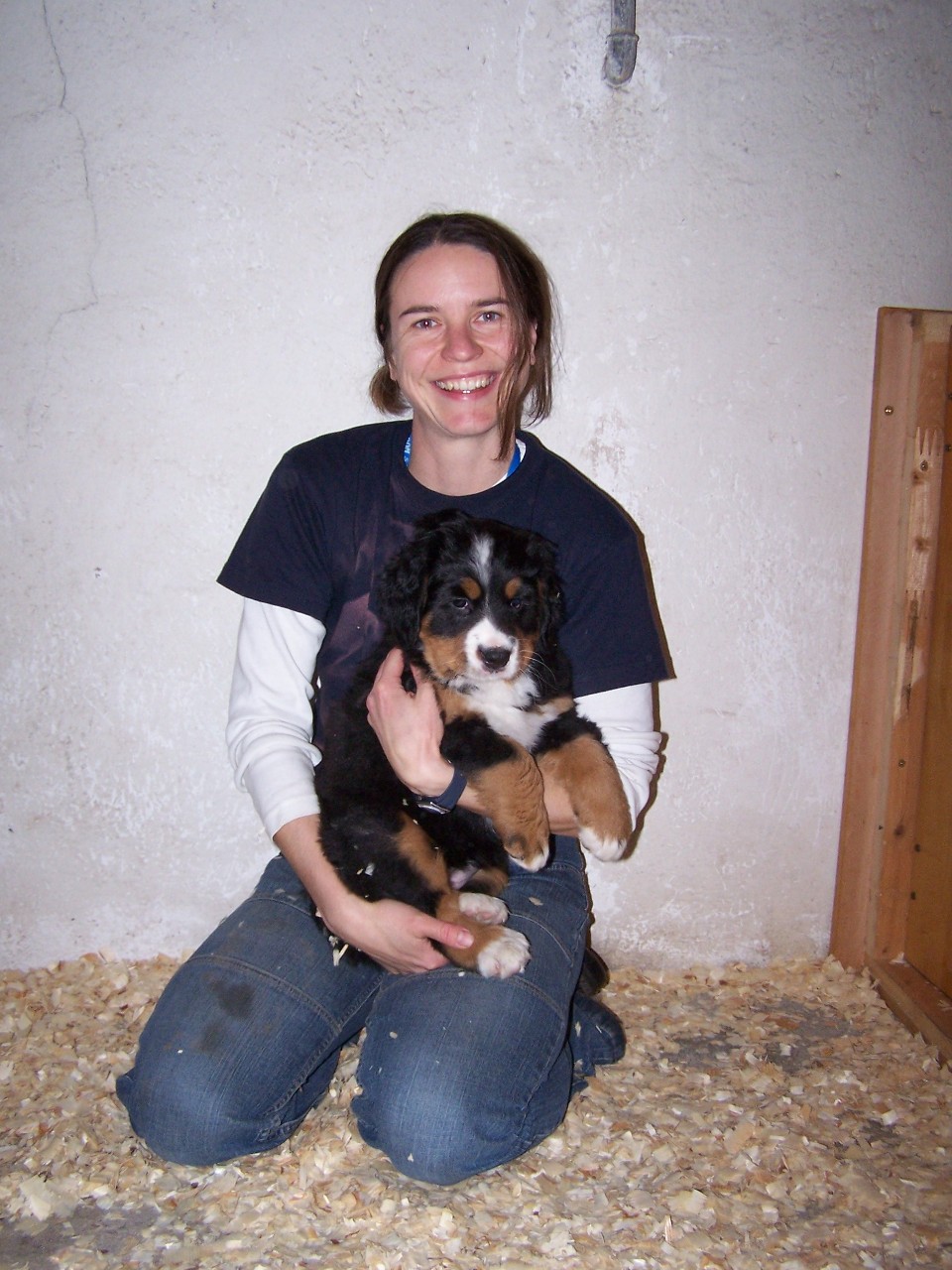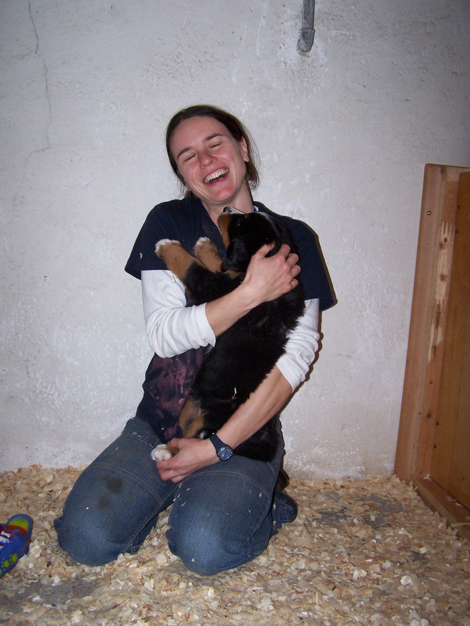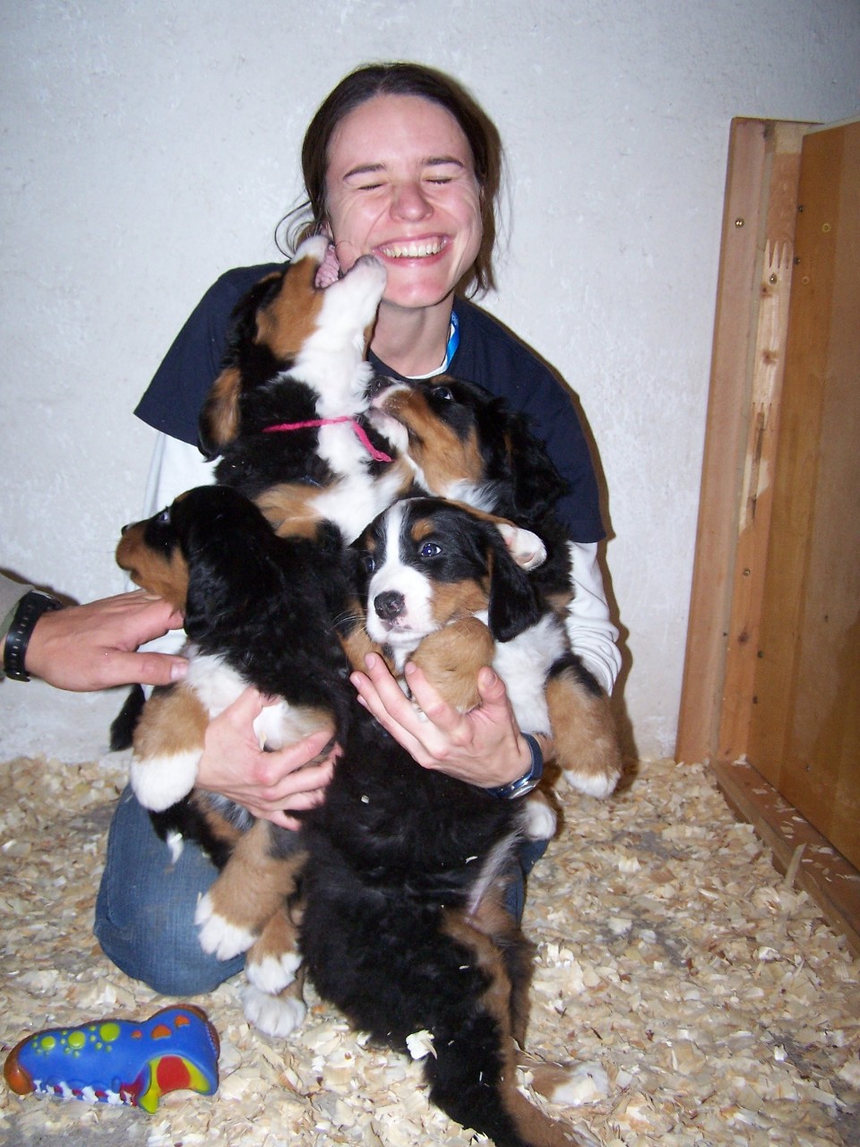 Dnes za námi přijel i tatínek našich štěňátek - fotit dohromady moc nešlo :-) Když už nejančily holčičky, tak poskakoval taťka - no uvidíme, zda se něco podařilo. Každopádně štěňátka měla z tak velkého psa (sice podobného mámě, ale přeci jen to není ono) respekt a chvíli se schovávala. Nejvíc si rozuměli s Adinou - ta si s ním nakonec chtěla i hrát. A kdoví jak by to dopadlo, kdybychom je nezavřeli...