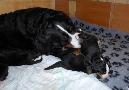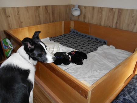 Štěňátka se staví na vratké nožičky a zdokonalují v chůzi po čtyřech. Občas ještě ztratí rovnováhu, ale chůze už to je! Drápky na prstíkách rostou rychle, jsou ostré jako jehličky a tak jsme je poprvé zastřihávali a zabrousili pilníčkem. To aby maminku Bertu štěňátka moc nepoškrábala. Přikrmujeme stále mlíčkem od Brita a Bertička mrňousky poctivě kojí. Krásně o ně pečuje, takže jsou štěňátka čisťoučká a zdárně prospívají. Štěňátka hladíme a mazlíme a užíváme si jejich pokroků.